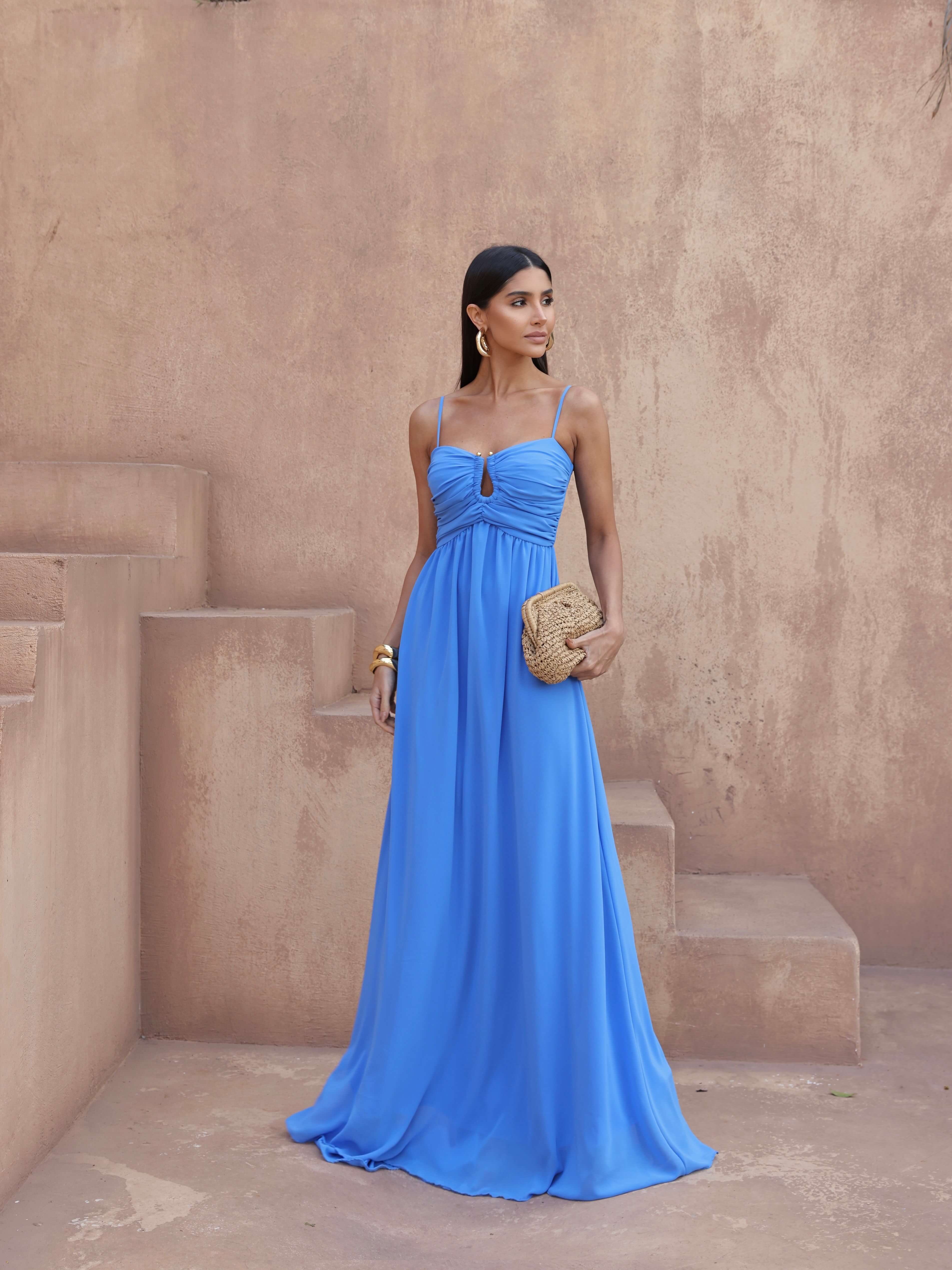 Este vestido longo com detalhe de argola no busto é uma peça sofisticada, perfeita para eventos que pedem um visual elegante e marcante. O decote de coração valoriza o colo de forma delicada e feminina, adicionando um toque romântico e sofisticado ao design. As alças finas com reguladores permitem um ajuste personalizado, garantindo conforto e segurança ao longo do uso. O detalhe de fivela no busto é um elemento diferenciado que adiciona charme e modernidade à peça, criando um ponto de destaque que complementa o visual. O plissado no busto proporciona textura e volume, valorizando ainda mais essa região com um acabamento refinado. A saia ampla confere movimento e leveza, criando um visual fluido e elegante que se destaca em qualquer ocasião. Com forro interno, o vestido oferece conforto e evita transparências, garantindo um acabamento de alta qualidade. O fechamento de zíper nas costas assegura praticidade ao vestir e proporciona um caimento impecável.