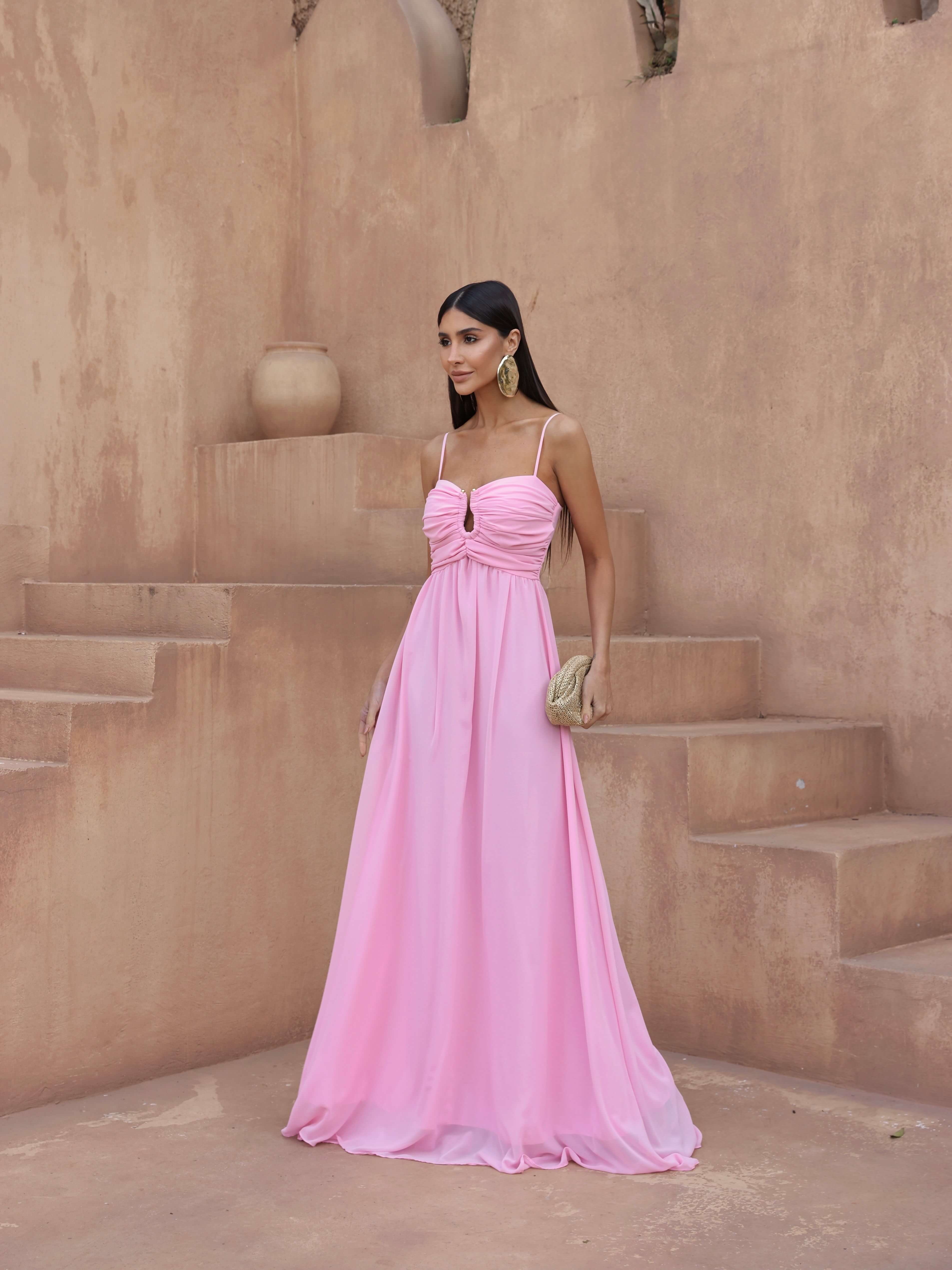Este vestido longo com detalhe de argola no busto é uma peça sofisticada, perfeita para eventos que pedem um visual elegante e marcante. O decote de coração valoriza o colo de forma delicada e feminina, adicionando um toque romântico e sofisticado ao design. As alças finas com reguladores permitem um ajuste personalizado, garantindo conforto e segurança ao longo do uso. O detalhe de fivela no busto é um elemento diferenciado que adiciona charme e modernidade à peça, criando um ponto de destaque que complementa o visual. O plissado no busto proporciona textura e volume, valorizando ainda mais essa região com um acabamento refinado. A saia ampla confere movimento e leveza, criando um visual fluido e elegante que se destaca em qualquer ocasião. Com forro interno, o vestido oferece conforto e evita transparências, garantindo um acabamento de alta qualidade. O fechamento de zíper nas costas assegura praticidade ao vestir e proporciona um caimento impecável.